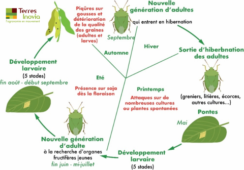 D’habitude, les adultes arrivent sur les parcelles aux alentours de la mi-juillet, autour du stade R3, marqué par l’apparition des premières gousses, mais le niveau des populations préjudiciables est atteint dès le mois de juin sur certaines parcelles.