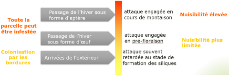 Lorsque les attaques sont tardives, souvent démarrant des bordures (après la floraison) les avortements de siliques sont plus limités et les capacités de compensation entre plantes plus importantes ; le PMG est impacté mais les pertes sont moins pénalisantes.