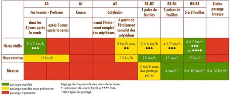 Il est important de garder en tête qu’une intervention précoce sera la plus efficace contre les adventices en place. La houe et la herse ne sont efficaces que sur des adventices peu développées (fil blanc, cotylédons, 2 feuilles). La bineuse, quant à elle, peut être efficace sur des adventices plus développées (3-4 feuilles pour la plupart des espèces). Il est recommandé d’intervenir par temps sec (sans pluie prévue dans les jours suivants) et toujours sur un sol bien ressuyé. Il est recommandé également de contrôler les relevées éventuelles d’adventices 8 à 10 jours après le passage des outils.