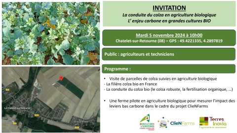 Une rencontre est organisée dans le cadre du projet européen ClieNFarms sur la conduite du colza en agriculture biologique et l'enjeu carbone en grandes cultures BIO.