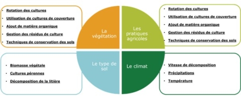 Le stockage du carbone dans les sols est lié à la dynamique des sols et aux pratiques modulant le retour de la matière organique au sol qui peut favoriser l’augmentation de la part de carbone stable dans les sols. En effet, par le processus de la photosynthèse, nécessaire à leur croissance, les plantes capturent le CO2 et le carbone devient alors constitutif de la plante. Si une partie est exportée à travers la récolte, une partie de la biomasse (racines, pailles) reste dans la parcelle. Cette biomasse va se dégrader en libérant du dioxyde de carbone (CO2) et des composés organiques qui, en se décomposant sous l’influence du climat et des conditions ambiantes du sol, vont évoluer sous des formes plus stables telles que l'humus, permettant un stockage du carbone dans les sols dans le temps. Les matières organiques d’origine résiduaire (effluents d’élevage ou résidus industriels ou urbains) utilisées comme intrants sur les cultures sont aussi des entrées potentielles de carbone avec des dynamiques spécifiques selon leur composition. L’évolution du stock de carbone organique dans les sols résulte donc de l’équilibre entre les apports de matières organiques au sol et leur minéralisation.