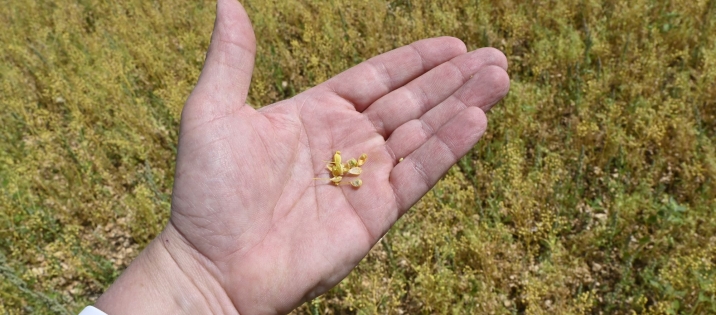 La cameline atteint sa maturité lorsque les siliques passent d’une teinte jaune citron à une coloration brunâtre. À ce stade, l’humidité des graines est généralement comprise entre 8 et 10 %. Elles se détachent facilement de leur enveloppe sous une légère pression manuelle.