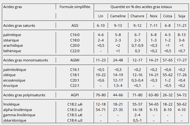 | Dont a-linoléniques (précurseur ω-3) | 28-50% |