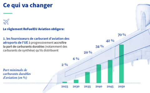 Par ailleurs, pour décarboner le secteur de l’aviation dans le cadre de la mise en œuvre de la loi européenne sur le climat, l’Union Européenne a adopté en 2024 le règlement RefuelEU Aviation. Ce règlement fixe des objectifs important d’incorporation de biocarburants à l’horizon 2050.