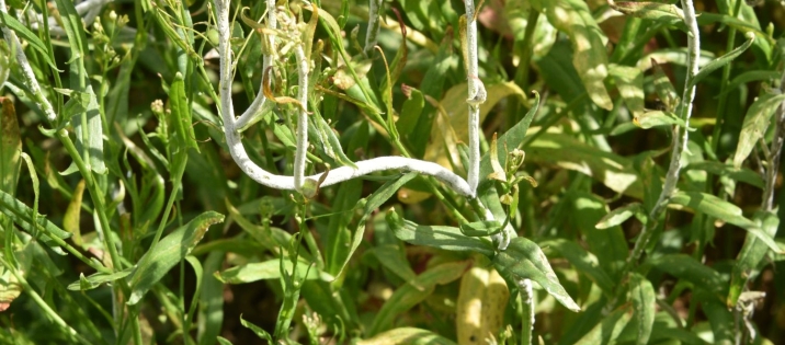 L’orobanche rameuse est une plante parasite non chlorophyllienne, présente sous forme de graines dans le sol. Elles ne peuvent germer qu’en présence de molécules émises par les racines de certaines plantes avant de se fixer sur ces dernières.
