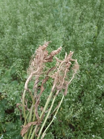 En arrachant les plantes atteintes, les racines présentent des déformations et renflements caractéristiques appelés « galle ». Ces galles sont responsables des symptômes aériens en nuisant à l’absorption de l’eau et des nutriments du sol. Elles sont initialement fermes et blanches à l’intérieur, brunissent progressivement avant de se fissurer.