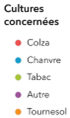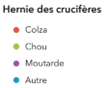 Il n’existe actuellement aucun moyen de lutte chimique efficace. Le développement de la maladie est favorisé par un mauvais drainage de la parcelle ainsi que par l’absence de chaulage sur les sols acides. Une fois installée, la maladie persiste durablement dans le sol, les spores pouvant rester viables jusqu’à 15 ans. Il est donc fortement déconseillé d’implanter de la cameline sur une parcelle connue pour être contaminée par cet agent pathogène. Ci-dessous, une carte présentant les parcelles infectées par la hernie des crucifères, recensées à la suite de déclarations effectuées en ligne sur le site de Terres Inovia. https://www.terresinovia.fr/-/enquete-hernie-des-cruciferes