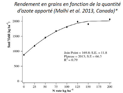 Des essais portant sur les doses d’azote ont été réalisés. Le rendement de la cameline augmente avec la fertilisation azotée, jusqu’à atteindre un plateau (voir graphique ci-dessous – source : Malhi et al., 2013, Canada). Cette augmentation de rendement s’explique par l’amélioration de plusieurs composantes : le nombre de plantes par mètre carré, le nombre de ramifications, le nombre de siliques par plante, ainsi que le nombre de graines par silique. En revanche, le poids de mille grains (PMG) ne semble pas être affecté (source : Agegnehu et al.1996, USA).