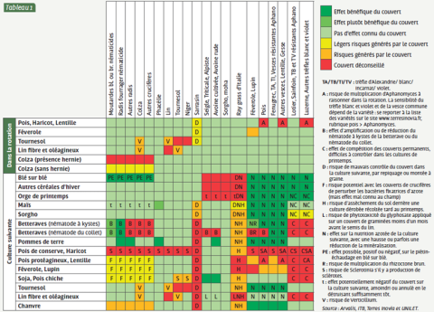 Tableau 2. Effets des principales espèces de couverts végétaux sur la culture suivantes et les autres cultures de la rotation (Source = Arvalis, Terres Inovia, ITB)