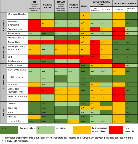 Enfin, chaque espèce est plus ou moins sensible aux différents modes de destruction possibles (cf. article destruction), la sensibilité des principales espèces de couvert à différents modes de destruction est présentée dans le tableau 5.
