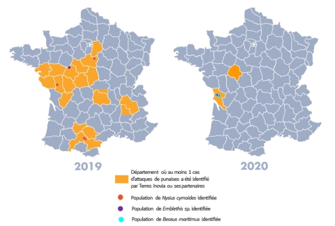 Localisation des attaques de punaises sur colza en 2019 et 2020 (situations non exhaustives)