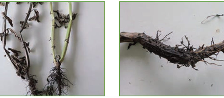 En cas d’attaque de Fusarium oxysporum (flétrissement vasculaire), les racines peuvent paraitre saines mais le système vasculaire présente une coloration rouge à noire.