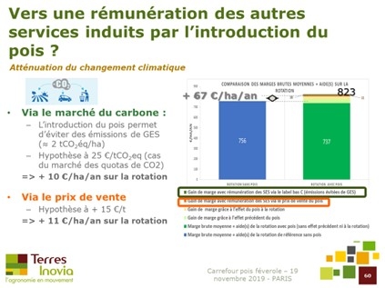 Le marché volontaire du Carbone pourrait permettre au cours des prochaines années, dans le cadre de contractualisation à la production, de rémunérer les émissions évitées de gaz à effet de serre grâce à des pratiques plus vertueuses. Ainsi, par exemple, l’introduction de légumineuses à graines comme un pois permet, selon les données expérimentales acquises à ce jour, d’économiser 2 téqCO2/ha d’émissions par rapport à une culture non légumineuse, principalement grâce à l’économie d’. Sur le marché du Carbone, le tonne d’équivalent CO2 pourrait se situer entre 25 et 100 €. Dans l’exemple ci-dessous, la tonne éq. CO2 est à 25€ (minimum).