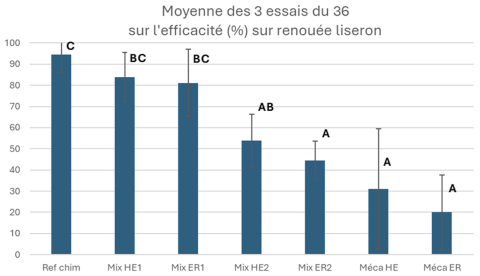 La modalité mixte avec herbicides de prélevée (Challenge 3 l/ha + Nirvana 1l/ha) puis herse étrille à 2-4 feuilles de la lentille (« mix 1 ») est la plus intéressante (plus de 80% d’efficacité) car satisfaisante et assez proche du programme chimique (« Ref chim »), tout en réduisant les IFT et les coûts.