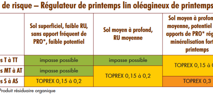 La régulation n’est pas systématique. En cas de risque de verse avéré (sensibilité de la variété, forte densité, forte minéralisation), appliquer un régulateur au stade 20 cm. Le lin de printemps est moins sujet à la verse que le lin d’hiver, car la plante est plus courte. De la même façon qu’en lin d’hiver, moduler la dose selon le risque de verse. Une dose trop élevée par rapport au risque de verse entraîne une réduction du potentiel de rendement.