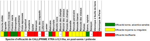 CALLIPRIME XTRA à 0,3 l/ha présente l’avantage de gérer efficacement les chénopodes et matricaires. Même si son action est plutôt moyenne sur morelle, renouées ou arroches étalées, il perturbe leur dynamique de croissance, facilitant leur contrôle en post-levée.
