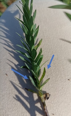 • Développement plus tardif de la maladie : symptômes de nécrose entourée d’un halo chlorotique se développant sur feuilles, tiges et capsules. Les symptômes sur feuilles et tiges sont les plus faciles à observer.