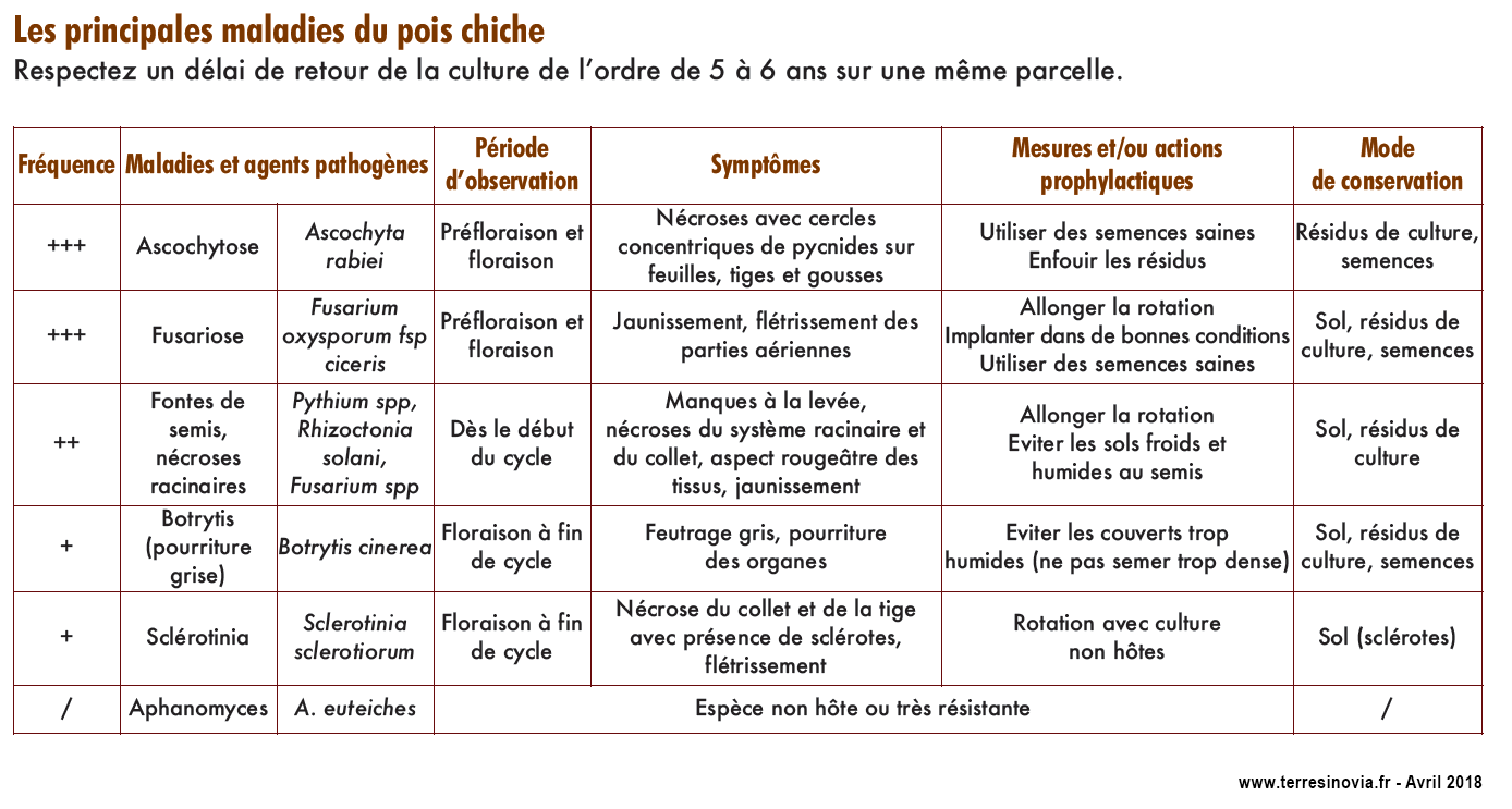 La maladie se développe si les températures sont supérieures à 25°C avec une forte humidité. Fusarium oxyporum fsp ciceris est un pathogène spécifique du pois chiche. La nuisibilité relative s’étend de 15 à 100 %. Il n’existe pas de solution au champ pour cette maladie.