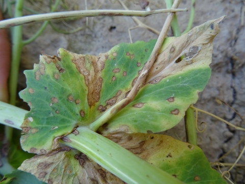 La bactériose (due à une bactérie, Pseudomonas syringae pv pisi) se manifeste sur les feuilles par de petites taches vert foncé à l’aspect huileux qui évoluent en plages plus ou moins larges, de formes irrégulières et anguleuses, de couleur marron foncé, parfois translucide.