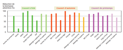 Figure 8. Taux de réduction de la biomasse adventice de différents couverts par rapport à un sol nu. Source : Cordeau et al. 2020.