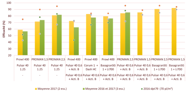 L’utilisation du métobromuron en prélevée contribue par ailleurs à réduire la pression de sélection. Dans ce contexte, l’augmentation de la dose de Proman (de 1,5 à 2,5 l/ha) n’apporte pas de gain supplémentaire lorsque Pulsar 40 est fractionné et associé à un adjuvant.