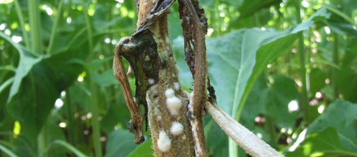 Les attaques de sclérotinia sur tige peuvent avoir deux origines : une contamination aérienne des feuilles adultes et une contamination racinaire du bas de la tige. Toutes deux évoluent en pourriture humide et blanchâtre, avec souvent des stries correspondant au front de croissance du champignon. Au fil du temps, des sclérotes noirs et dodus prennent forme dans et sur la portion de tige malade, qui peut finir par casser.