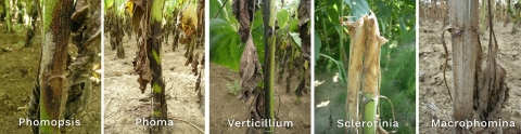 La progression d’une tache foliaire de phomopsis via le pétiole conduit à la formation d’une tache brun-rouge aux contours frangés centrée sur le point d'insertion de la feuille. La tache peut évoluer jusqu’à encercler complètement la tige. La destruction des tissus est profonde (la zone malade est « crunchy » lorsque l’on appuie dessus) et entraîne l’arrêt de la circulation de la sève. La nuisibilité de la maladie est accrue lorsque la tige malade fragilisée casse au moindre choc (pluie, vent, rabatteurs de la moissonneuse batteuse).