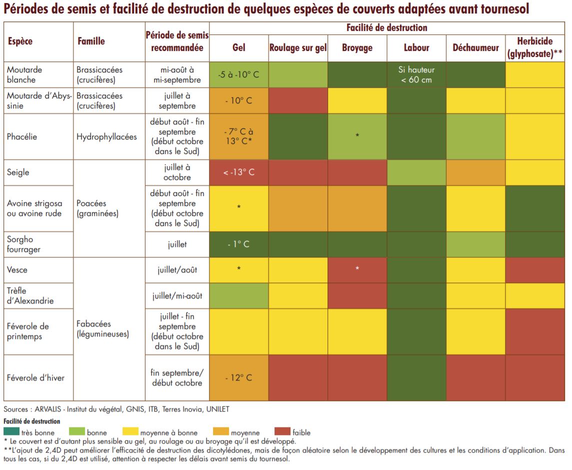 Détruire les couverts dès le début de floraison pour éviter les grenaisons et ceux à forte croissance [> 2 t/ha de matière sèche (MS), soit > 1 kg/m² de matière verte pour un couvert à 20 % de MS] dès la fin novembre et au plus tard deux mois avant la date prévue du semis du tournesol s’il ne comportent pas de légumineuses.