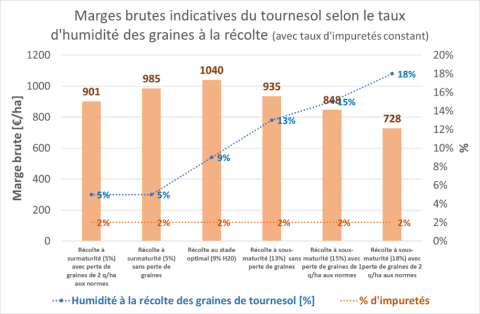 De même, une récolte avec une teneur en eau élevée s’accompagne d’une forte dégradation de la marge. Ainsi, par rapport à une récolte au stade optimal, la marge est réduite de 105 €/ha pour une récolte à 13% d’humidité, de 192 €/ha à 15% d’humidité (avec 1 q/ha de pertes aux normes) et de 312 €/ha à 18% d’humidité (avec 2 q/ha de pertes aux normes), taux d’humidité plafond pour un tournesol récoltable à la moissonneuse-batteuse.
