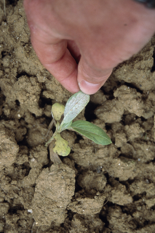 En début de cycle, les plantules contaminées présentent un retard de croissance, elles apparaissent « rabougries », montrent des cotylédons jaunes. Des zones décolorées vert plus clair sont visibles sur les feuilles, dont la face inférieure est recouverte d’un feutrage blanc plus ou moins intense : ce feutrage correspond aux sporulations du mildiou, à partir desquelles pourront se déclarer des contaminations secondaires mais surtout « se fabriquer » l’inoculum pour les campagnes suivantes. Le mildiou va peu à peu coloniser tous les tissus de la plante et « monter dans les étages » : on dit qu’il est systémique et son développement à l’intérieur de la plante entraîne un nanisme caractéristique : les entre-nœuds sont raccourcis.