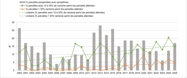 La surveillance du territoire national a mis en évidence une pression mildiou en augmentation depuis 6 ans : entre 12 et 19% de parcelles touchées, avec une augmentation significative de la proportion des attaques graves à plus de 10% de pieds nanifiés.