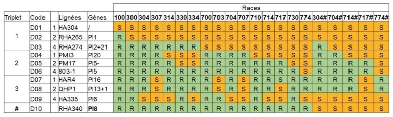 Tableau : lignées différentielles utilisées pour la détermination des races de mildiou en France. S : la race est virulente, R : la race est avirulente