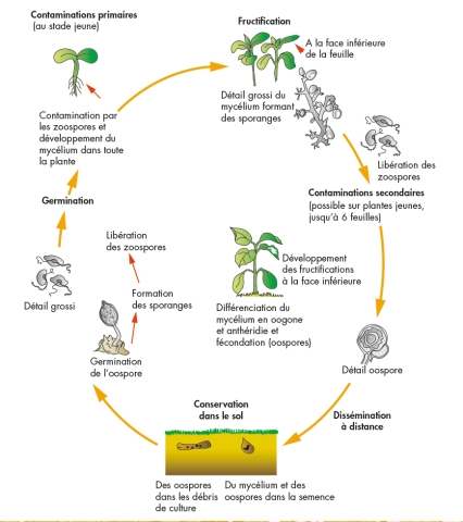 L’infection primaire se déroule au printemps et se passe sous forme souterraine via la germination d’oospores. Dans des conditions humides et fraîches, ces oospores vont entraîner la formation de zoosporanges, une structure de fructification produisant les zoospores. Ces zoospores sont biflagellées et vont aller infecter les racines de la plante. La contamination secondaire, contrairement à la primaire, se produit en phase aérienne. Les sporangiophores qui se trouvent sur les cotylédons ou sur la face inférieure des feuilles, vont entraîner la formation de sporanges qui seront disséminés par le vent, et produiront les zoospores responsables de l’infection secondaires. Cette étape est responsable des infections tardives des plantes voisines et contribue à la dissémination de l’agent pathogène.