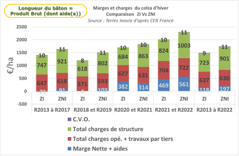 Entre 2013 et 2022, les marges du colza sont inférieures  en ZI par rapport aux ZNI. Cet écart s’explique essentiellement par les différences de rendement moyen. Avec des charges opérationnelles et travaux par tiers comparables entre ZI et ZNI, l’écart de marges brutes entre ZI et ZNI est de +257 €/ha en faveur des ZNI. Mais, les charges de structure en ZNI étant plus élevées qu’en ZI (+178 €/ha), l’écart de marge nette en faveur des ZNI n’est « que » de +79€/ha.