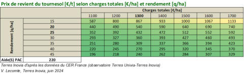 Prenons l’exemple du tournesol. Augmenter le rendement à charges totales constantes permet de baisser le prix de revient. Voir le graphe suivant avec l’exemple de la récolte 2024.