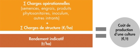 Le coût de production exprimé en €/t de graines produite est un indicateur complémentaire à la marge. Il donne des éléments concrets sur les performances économiques de la production considérée (par exemple une culture), que l’on peut comparer à d’autres situations équivalentes dans le cadre, par exemple, de suivis de groupes de fermes. Il permet par ailleurs d’aider à décider de l’opportunité de nouveaux investissements, grâce à la simulation (ex : irrigation ; choix d’un nouveau matériel), ou d’évaluer les effets d’évolution(s) de l’environnement (prix des intrants) et de la conduite culturale sur les résultats économiques et la compétitivité de la production considérée sur les marchés.