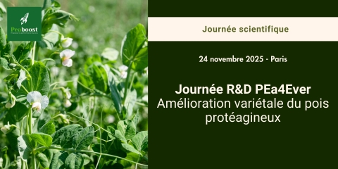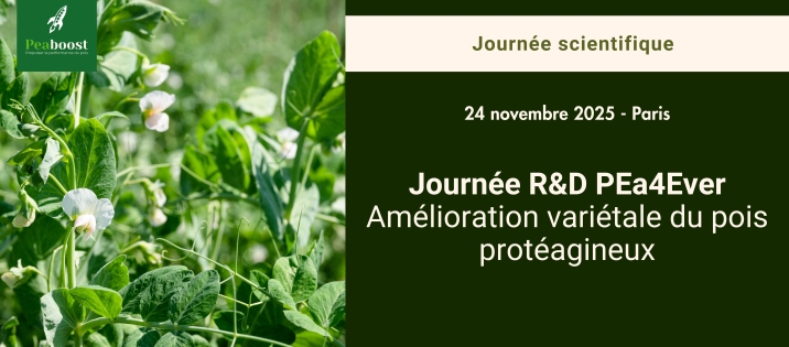 Vous êtes invités à vous joindre à la 1ère journée ouverte du programme de R&D PEa4Ever dédié à l'amélioration variétale du pois protéagineux comme levier de la relance de la culture et de sa filière. Cette journée vise à présenter à tous ceux qui sont intéressés par ces sujets à la fois les avancées du programme, et également celles d'autres travaux de la communauté scientifique et technique s'intéressant au pois, dans le but de stimuler les travaux existants, leur valorisation, et de nouvelles pistes de travail.