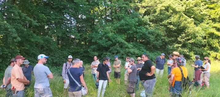 Un agriculteur suisse présente ses surfaces de promotion de la biodiversité aux agriculteurs du projet R2D2 lors d’une journée technique (Crédit : N. cerrutti)