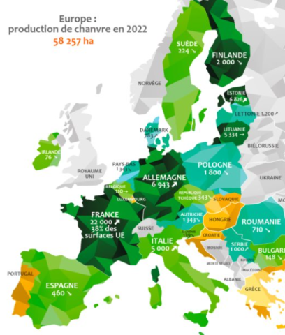 Depuis quelques années, le chanvre gagne du terrain, dans le monde d’abord où la production a été multipliée par deux en l’espace de cinq ans, avec 185 248 ha (chiffres 2022). « La France est le deuxième pays au monde », a précisé Nathalie Fichaux, directrice d’InterChanvre. L’hexagone est même le premier pays producteur européen, avec 22 000 ha, soit 38 % des surfaces européennes. « Elles ont triplées en dix ans. L’objectif est de multiplier les surfaces par deux d’ici cinq ans ».