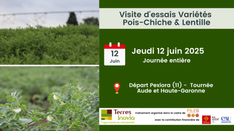 - 10h10-10h40 : Visite de l’essai variétés Pois chiche mis en place par Terres Inovia, Castelnaudary 11400