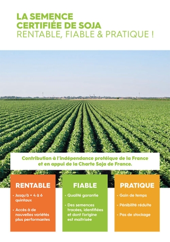 Lancée en 2018, cette démarche de certification en filière repose sur quatre engagements : des graines et des produits issus du soja d’origine France, non OGM, tracés et durables. Elle engage les trois maillons de la filière : la production de graines, la collecte et la première transformation.