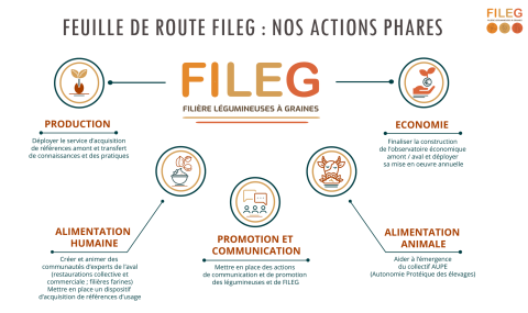 • Restauration collective : afin d’intégrer davantage de légumineuses à graines dans ce segment de marché, , FILEG a constitué un groupe de travail avec les chefs cuisiniers et les gestionnaires de distributeurs en restauration collective et de collectivités, qui a par exemple réalisé des tests de produits, expérimenté des outils ludo-pédagogiques. Une étude territoriale pour comprendre ce marché est en cours.