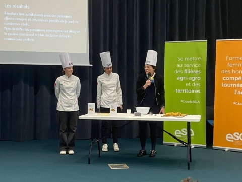 Ce projet a été créé par un groupe de quatre étudiants de 2ème année de bachelor en arts culinaires à l’Institut Lyfe (ex-Institut Paul Bocuse). Ils proposent un kit de préparation de pâtisserie, notamment des cookies à base de farine de lupin. L’équipe a même sollicité une personne du public pour démontrer la facilité de préparation des cookies en temps réel !