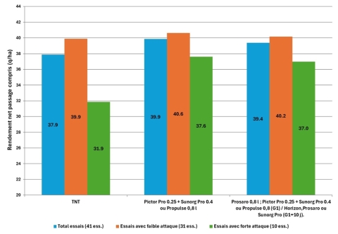 Les stratégies à double traitement (2ème traitement 10/15 jours après le stade G1) ne montrent pas de gain d’efficacité vis-à-vis du sclérotinia dans la très grande majorité des situations. Elles sont très rarement rentables : le rendement net (coût fongicides et passages déduits) est plus faible pour la double application que pour un passage unique au stade G1 (figure). Elles peuvent néanmoins montrer un intérêt, qui reste aléatoire, dans quelques situations à très haut potentiel de rendement en situation de floraison très longue, de fortes pressions maladies en fin de cycle (mycosphaerella, alternaria, oïdium) qui nécessiteraient un relai, de première intervention trop anticipée pour assurer une protection correcte de la floraison.