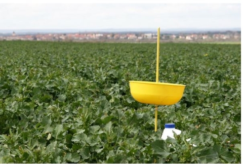 Le piège à insecte «la cuvette jaune», est l'outil indispensable pour le suivi du colza. A ce stade de la campagne, la cuvette doit être posée sur végétation. Sa mise en place en amont de l’arrivée des insectes dans les parcelles est indispensable car cela permet ainsi de détecter les vols de ravageurs. Identifier la date d’arrivée d’un ravageur comme le charançon de la tige du colza est primordial pour raisonner la date d’intervention (voir ci-dessous). |