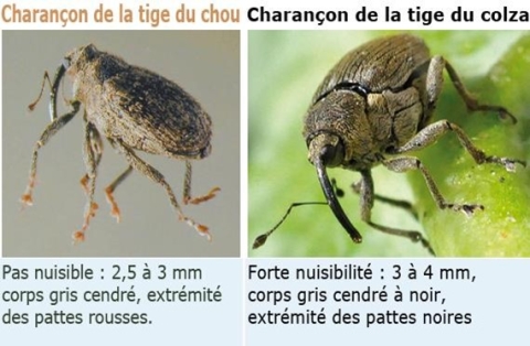 Attention à ne pas confondre charançons de la tige du colza et charançons de la tige du choux (extrémité des pates rousse), ce dernier étant non nuisible pour le colza et souvent avec une arrivée plus précoce que celui de la tige du colza.