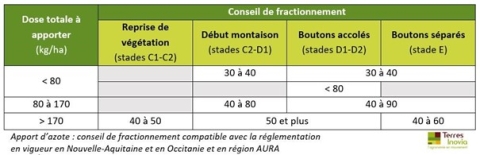 Selon l’état du colza en sortie hiver, et la dose totale d’azote à apporter, la stratégie d’apport sera différente pour permettre de valoriser au mieux chaque unité apportée. Le tableau ci-dessous indique, selon la dose d’azote à apporter, la stratégie de fractionnement conseillée, compatible avec la réglementation en vigueur en Nouvelle-Aquitaine et en Occitanie et en région AURA.