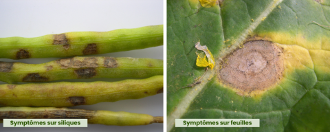 Pour l’oïdium, la protection de type curative est conditionnée par l’observation des premiers symptômes. Néanmoins, bien qu’efficace, la lutte curative contre l’oïdium est parfois difficile à mettre en œuvre car les colzas sont hauts et avancés lorsque les premiers symptômes ,de tache étoilée sur feuilles apparaissent, (Droite de la photo).