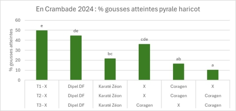 La pyrale du haricot particulièrement impactante en 2022 et 2023 sur les zones de production en sec du Lot-et-Garonne notamment, a eu un impact négligeable en 2024 (ponctuellement, des attaques plus sévères ont pu être observées). Plusieurs dispositifs avaient pourtant été mis en place de façon à progresser sur l’identification des moyens de lutte (lutte chimique et lutte par les trichogrammes entre autres).