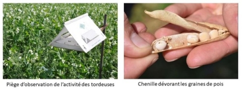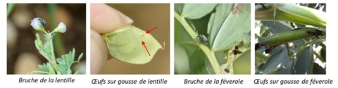 En pois et féverole, une protection insecticide, qui vise les adultes, n’est que rarement efficace et peu valorisée en raison de la longueur de la phase de risque, du stade jeunes gousses 2 cm sur le premier étage fructifère jusqu’à fin floraison + 10 jours (une seule application réglementairement possible en floraison). Cette application nécessite un fort volume d’eau (au moins 200 L/ha) pour pénétrer le couvert. Cette application permet de limiter le risque mais ne garantit pas toujours d’atteindre certains seuils qualité exigés en alimentation humaine par exemple.